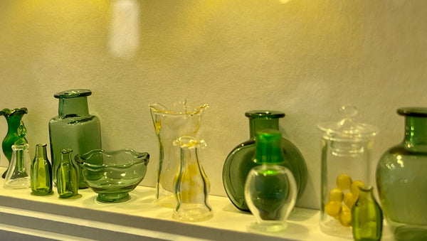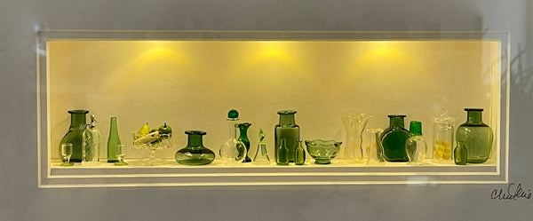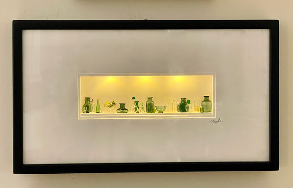 Miniature 1:12 scale handblown glass from England. This beautiful collection consists of green and clear glass with a hint of yellow. Each piece is carefully made by hand. There are three interior LED lights, on/off switch on top of frame. Runs on 9 volt battery stored in pouch in back of frame. Looks beautiful with lights on or off. Frame measures 18 3/4"wide x 11"high x 2 1/4"deep. Framed behind glass and ready for display.
