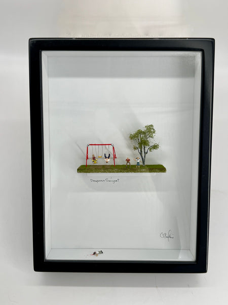 This miniature diorama depicts one of those cheap swing sets that lift off the ground depending on the weight distribution. One child has fallen to the bottom of the frame and has injured himself. Two friends look on worried while others are swinging away oblivious to the danger. From the Darker Side series this is Dangerous Swingset.