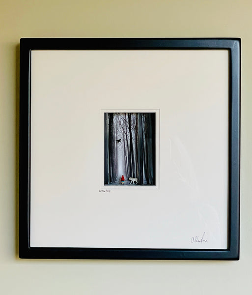 Little Red Riding Hood is happily walking along the wooded path on her way to grandmas house with a basket full of homemade goodies. Along the way she is met by a sly and hungry wolf. A crow calls out a warning. Frame measures (from the outside edge) 13"x13"x1 1/2".