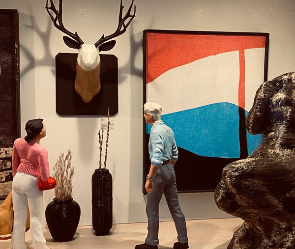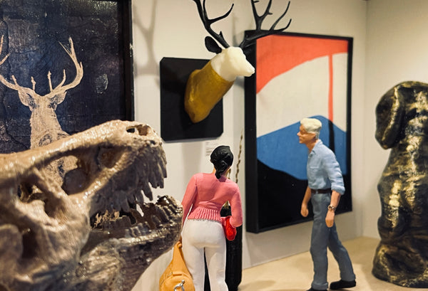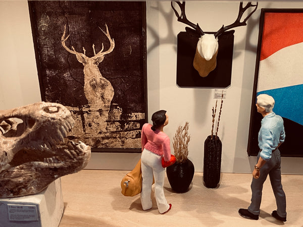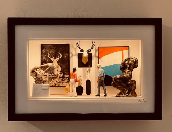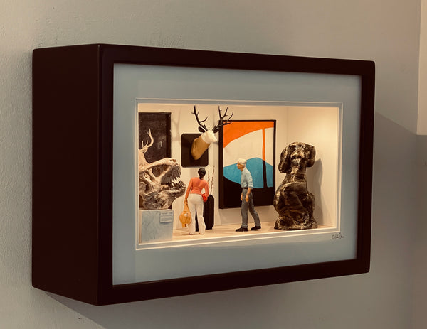 At the Museum diorama. A couple of people seem interested in the deer sculpture display or maybe its the way the antlers are reflected on the wall. Handmade One of a Kind diorama. LED lighting is operated by a switch on top of the frame. Runs on battery or electric and both options are included with sale. Frame measures 15"wide x 10"high x 5 1/4"deep. Framed behind glass and ready to display.